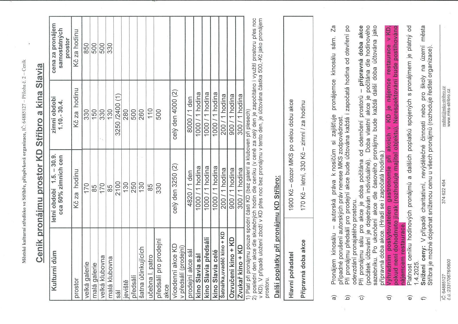 Ceník pronájmu KD, Kino